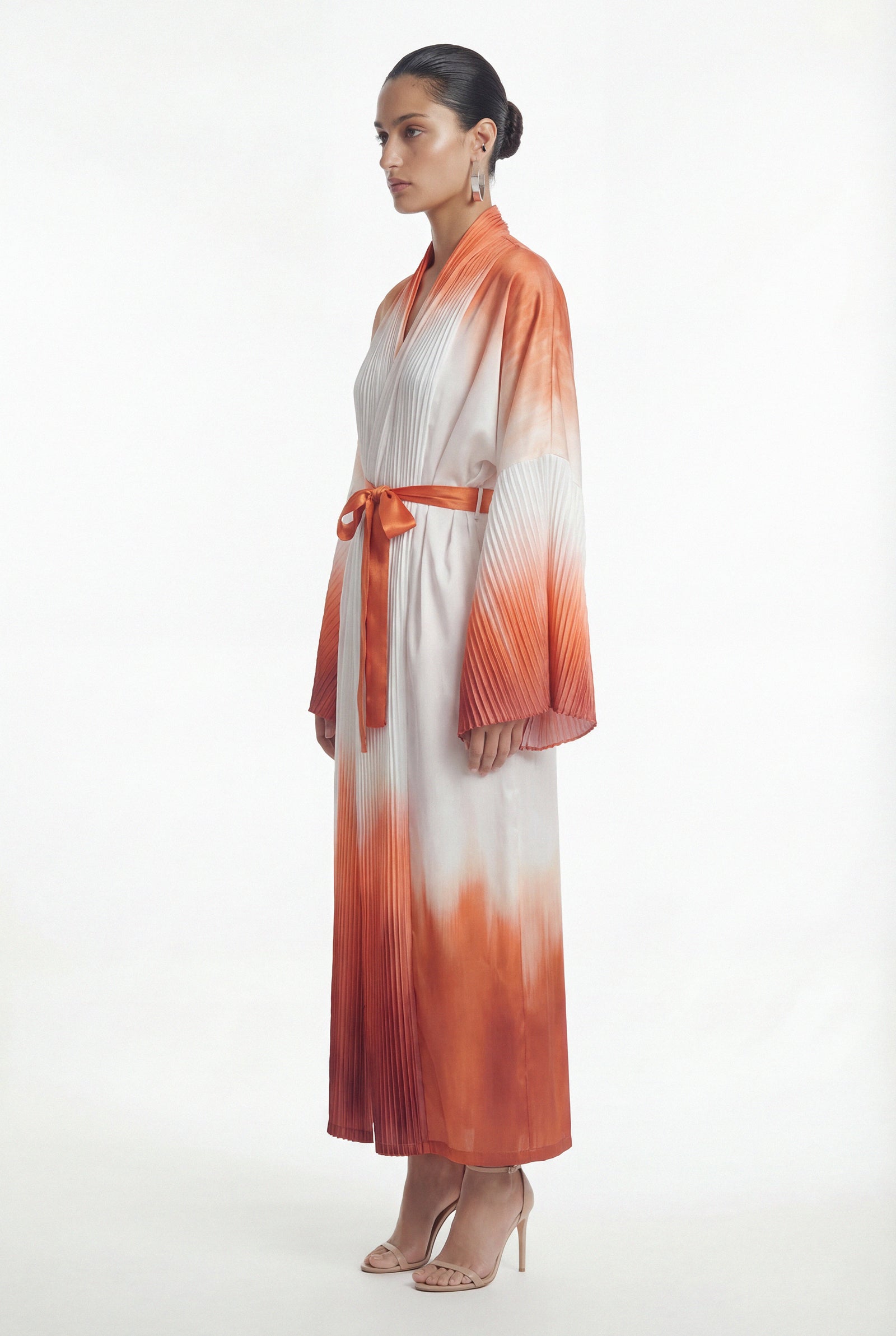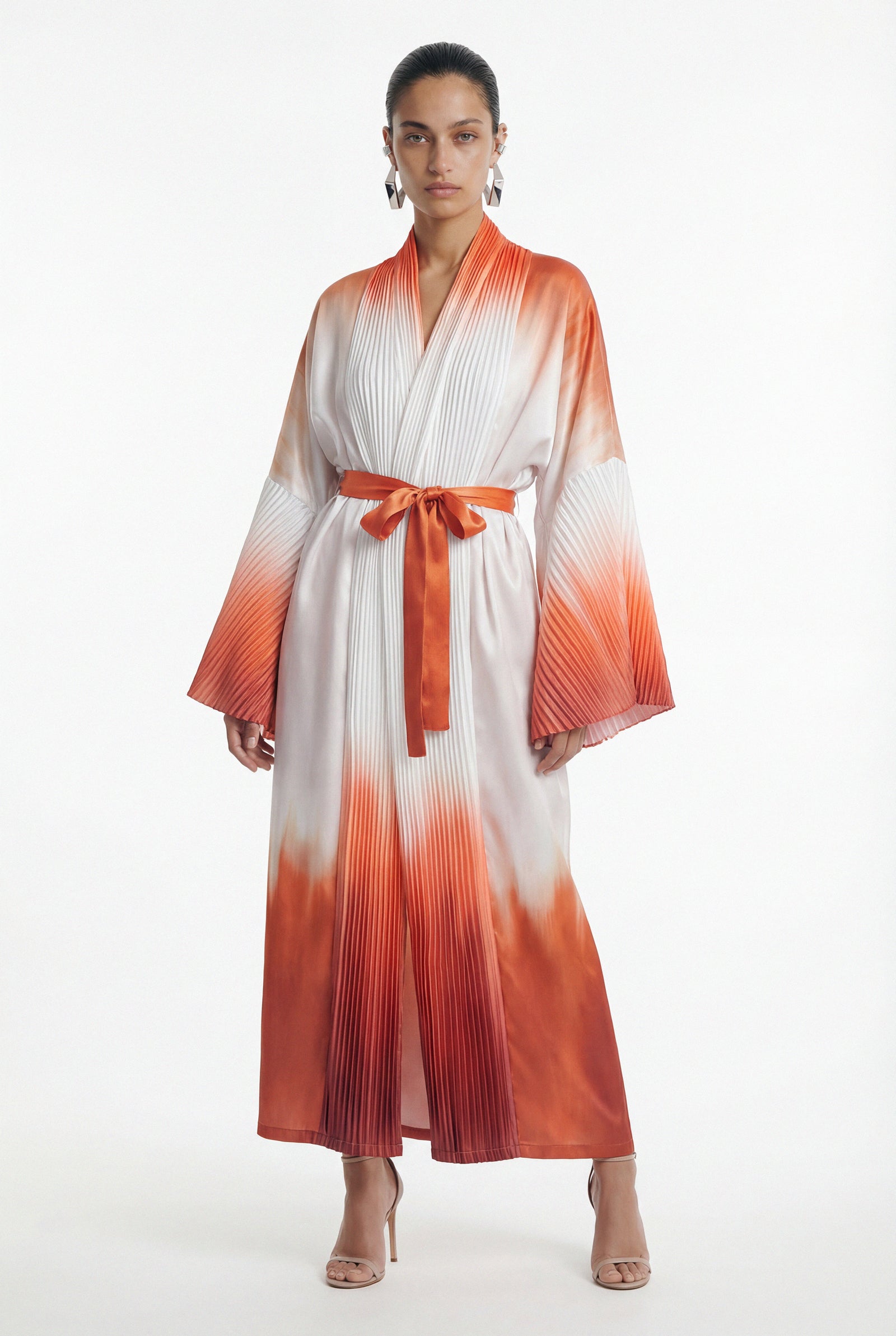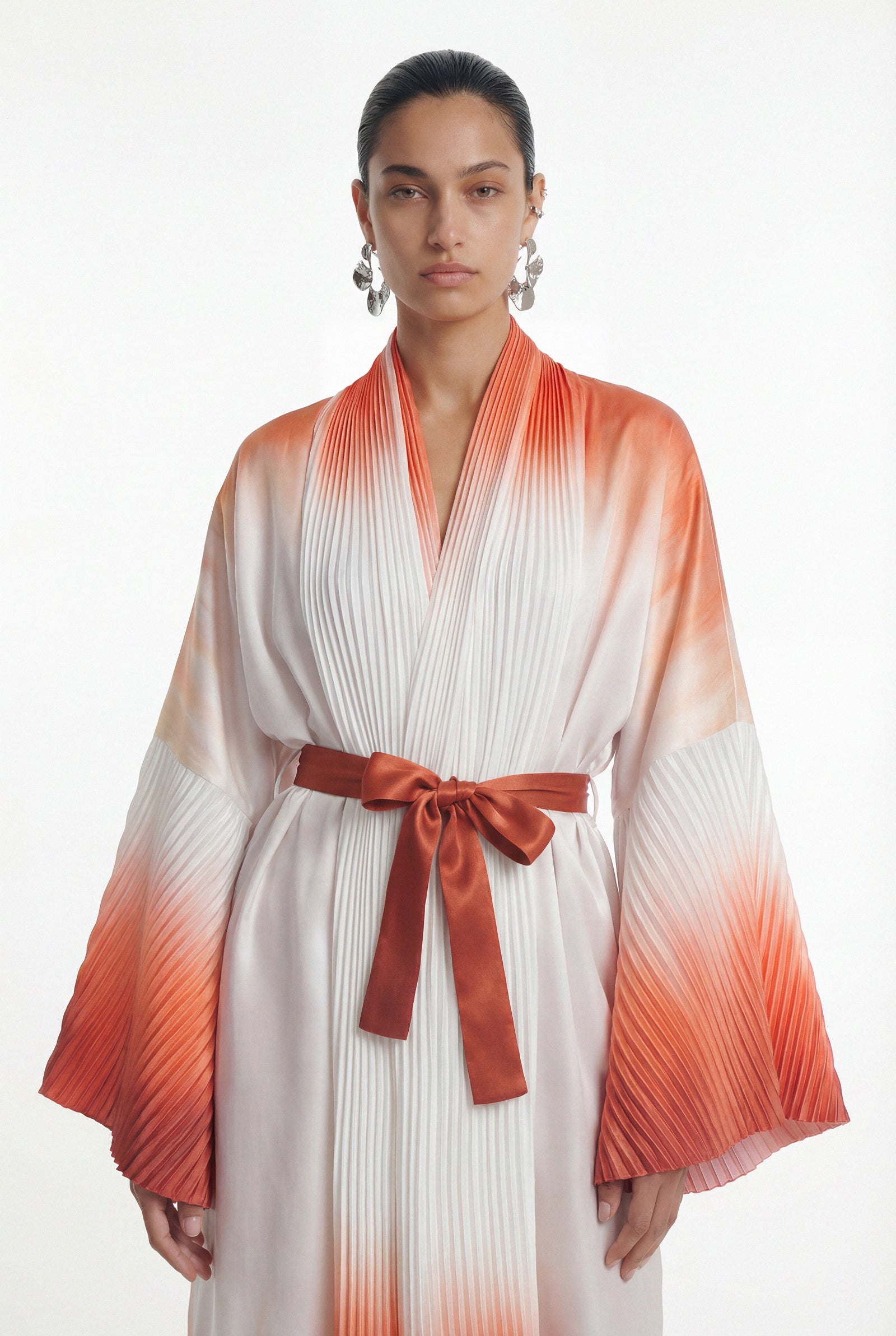• Elegant silhouette accentuated by a sash belt at the waist.