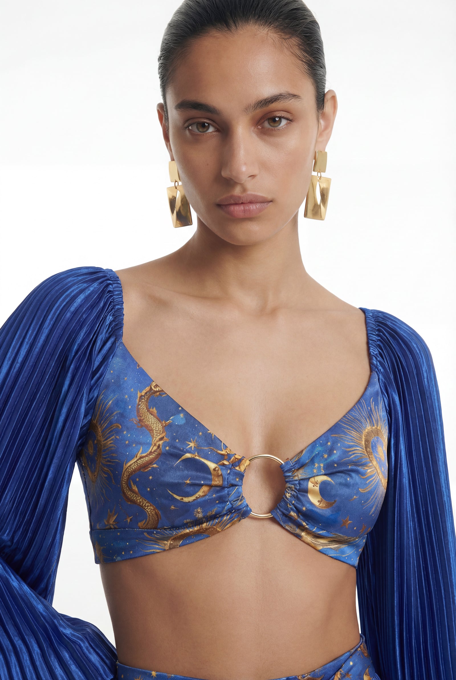 • The deep V-neck gains a stylish touch with the ring-shaped gold accessory detail.